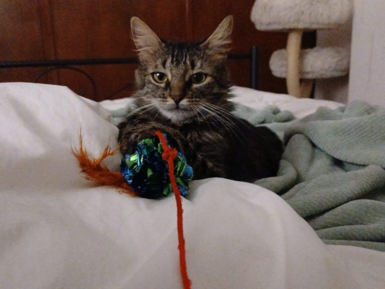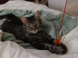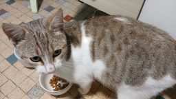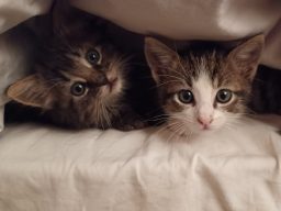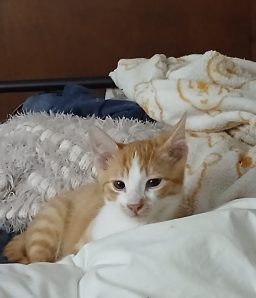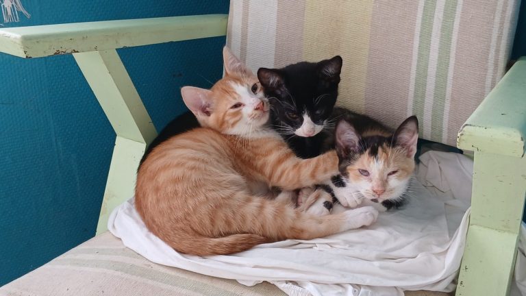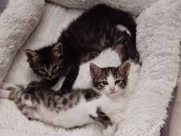 Ces trois chatons âgés d'environ trois mois ont été retirés d'un environnement peu sain (surpopulation de chats, coryza, pauvre alimetation, etc). Ils vont tous les toirs très bien et continuent de grandir. Ils seront certainement proposés à l'adoption lorsqu'ils auront atteint l'âge pour être stérilisés. Ils auront également besoin de leur primo-vaccination et d'être pucés.